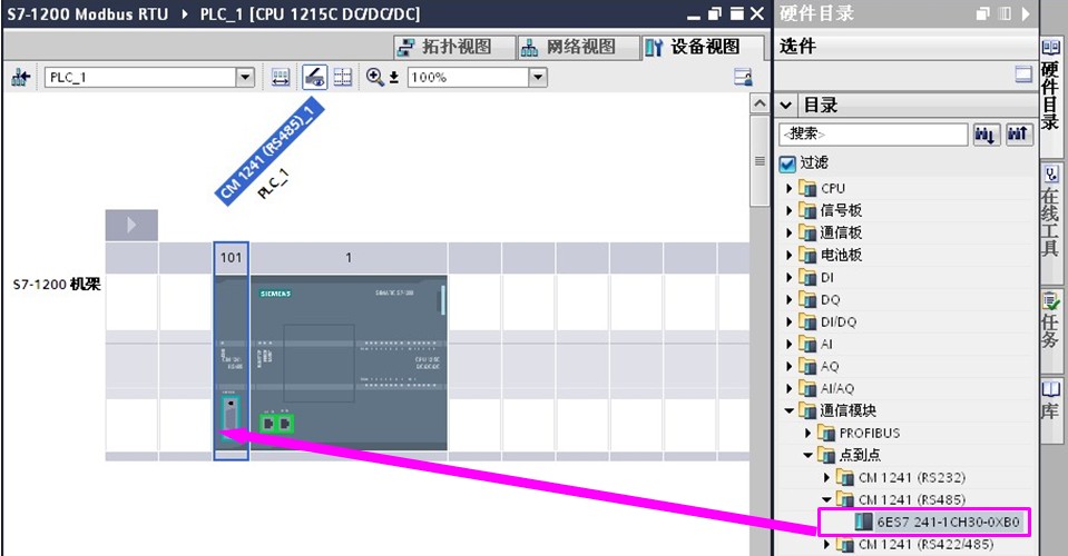 在硬件目录里找到“通信模块”→“点到点”→“CM1241(RS485)”,双击或拖拽此模块至CPU左侧即可,如下图1所示: