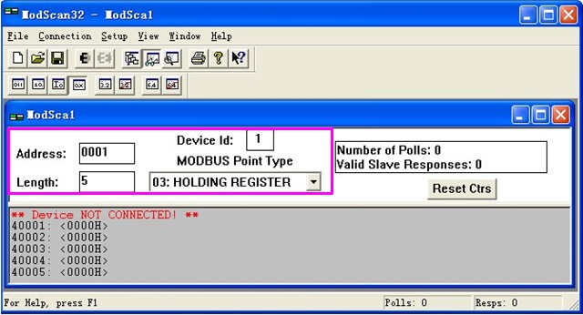 选择“File”→“New” 打开ModScan通信界面,设置Modbus RTU从站的地址Device Id=1,数据开始地址Address=0001,数据长度Length=5,Modbus数据类型功能码03,如下图11所示: