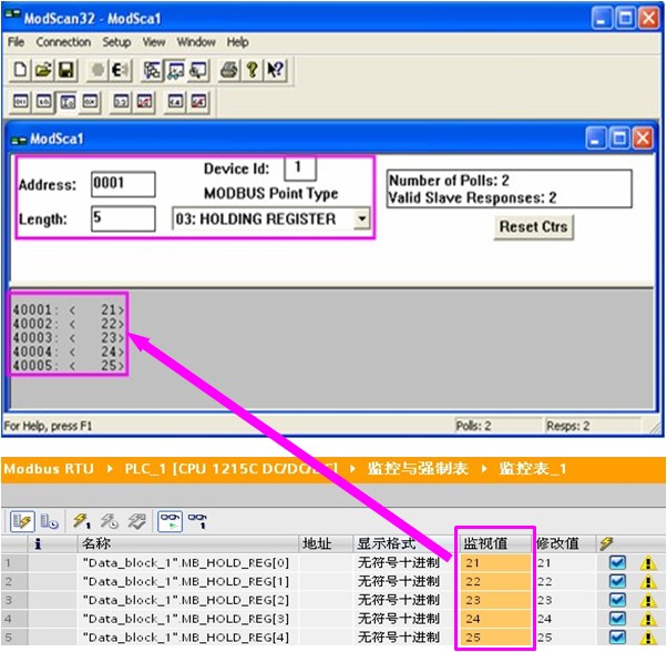在STEP 7 V11 Professional SP2 UPD4软件中打开该项目CPU1215 DC/DC/DC的“监控表”,对DB3.DBW0写入数值21,DB3.DBW2写入数值22,DB3.DBW4写入数值23,DB3.DBW6写入数值24,DB3.DBW8写入数值25。ModScan主站将S7-1200 Modbus RTU从站地址DB3.DBW0的数值21,DB3.DBW2的数值22,DB3.DBW4的数值23,DB3.DBW6的数值24,DB3.DBW8的数值25,分别读取到了地址40001,40002,40003,40004,40005中。如下图12所示:
