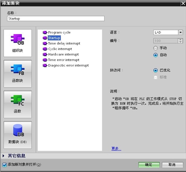 在项目树下选择“CPU1215C DC/DC/DC”→“程序块”→“添加新块”,在弹出的窗口中选择“OB 组织块”→ “Startup”,添加启动OB 100,如下图4所示: