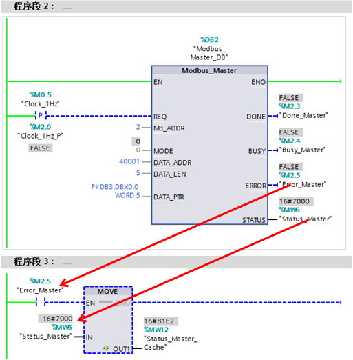 Modbus_Master指令“STATUS” 参数中的错误代码仅在“ERROR” = TRUE 的扫描周期内有效,为了获取了Modbus RTU通信错误的错误代码我们可以采用下图19. 方式编程。