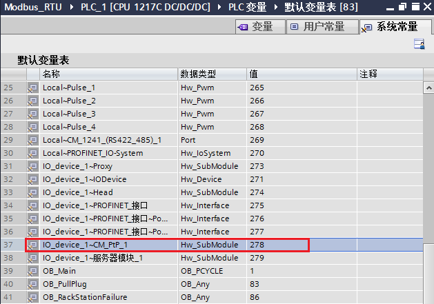 ②分布式IO 站点的硬件标识符也可以在"PLC变量"--->"系统常数"中查询。