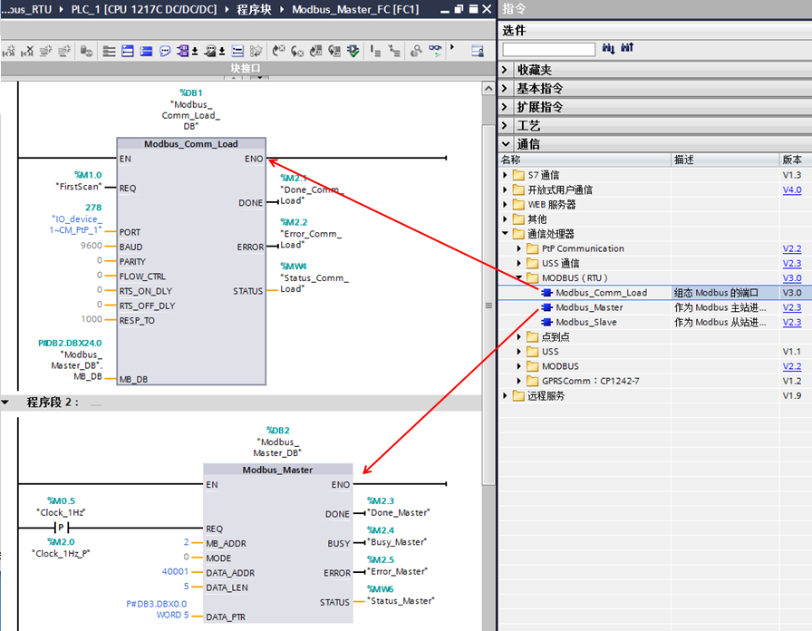 Modbus RTU主站编程需要调用Modbus_Comm_Load 指令和Modbus_Master 指令,其中Modbus_Comm_Load 指令通过 Modbus RTU 协议对通信模块进行组态,Modbus_Master 指令可通过由 Modbus_Comm_Load 指令组态的端口作为 Modbus 主站进行通信, Modbus_Comm_Load 指令的 MB_DB 参数必须连接到 Modbus_Master 指令的(静态)MB_DB 参数。