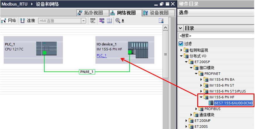 打开网络视图并拖入一个ET200SP站点,并将其分配给相应的IO 控制器(本例CPU1217C 为 IO 控制器),如图8.所示。