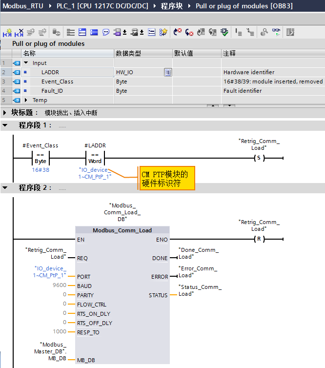 CM PTP 模块被重新插入的时候,需要在中断OB83中调用Modbus_Comm_Load 指令对通信模块进行重新组态,如图15. 所示。