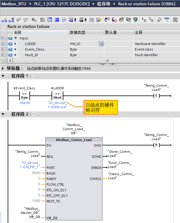 ①OB86 中调用Modbus_Comm_Load指令的背景数据块需要与OB1中调用的Modbus_Comm_Load指令的背景数据块相同。