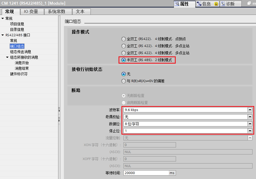 接下来,在“设备视图”中用鼠标选中CM1241(RS422/485)模块,在“属性”→“端口组态”中配置此模块硬件接口参数,