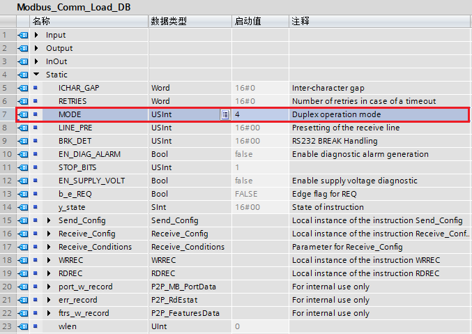 2 .Modbus_Comm_Load指令背景数据块中的静态变量“MODE”的作用是什么?为什么一般项目中,都需要对该变量进行修改?