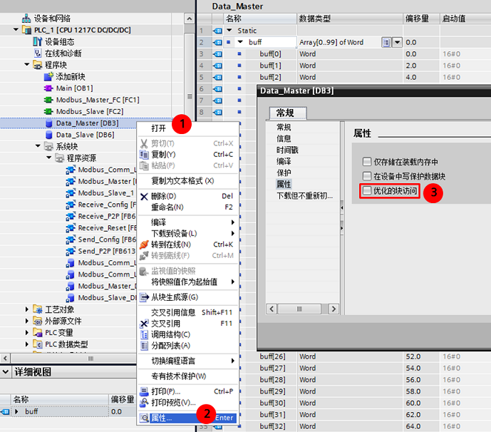 ③Modbus_Master指令的“DATA_PTR”参数用于指向要进行数据写入或数据读取的数据区域地址,该数据区域支持优化访问的数据块或者非优化(标准的)数据块,建议采用非优化访问的数据块。