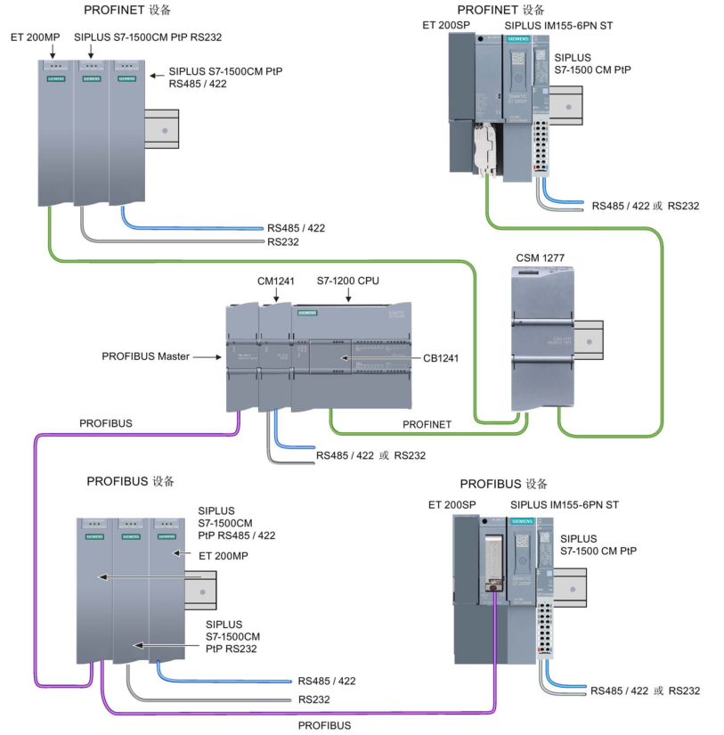 PROFINET 或 PROFIBUS 分布式 I/O 机架上的PtP通信模块实现Modbus RTU通信。