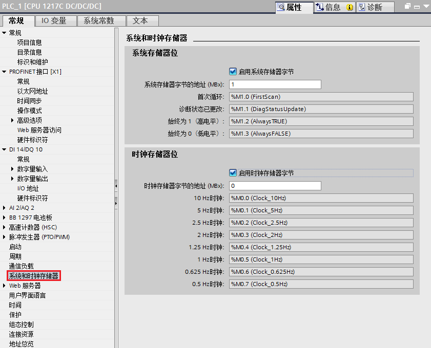 另外,S7-1200 还提供了系统和时钟存储器功能,为了便于后续指令,建议使能该功能。在CPU “属性”→“常规”→“系统和时钟存储器”使能系统和时钟存储器功能,如图7. 所示。