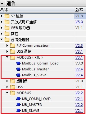 S7-1200 PLC 的 Modbus RTU 有两类指令"MODBUS (RTU) "和"MODBUS",如图1所示。指令区别和适用范围参考以下的各指令编程例程介绍。