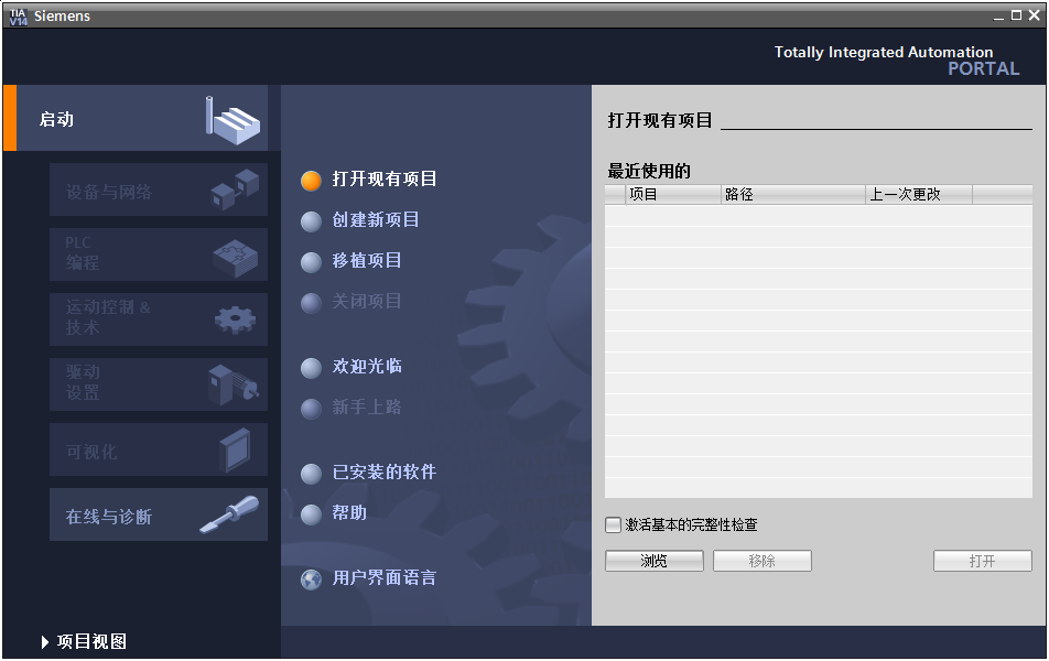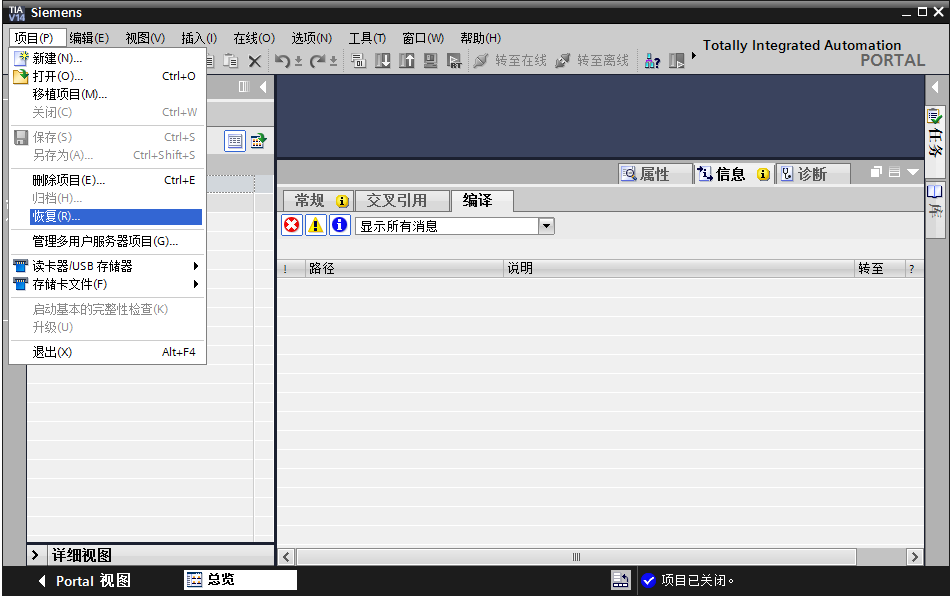 1. 打开TIA博途软件,通过软件左下方“项目视图”按钮切换至项目视图: