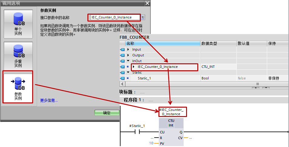 4. 在DB块、FB的静态变量、FC和FB的INOUT变量中新建IEC_COUNTER、CTU_INT、CTD_INT、CTUD_INT类型变量,在程序中将计数器指令拖入块中时,在弹出的“调用选项”页面点击“取消”按钮,之后将该建好的变量填入指定位置。