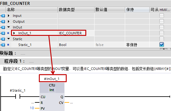 (3) FC和FB的INOUT变量中新建IEC_COUNTER等类型变量(LAD/FBD),如果是IEC_COUNTER等类型变量的数组,S7-1200从V2.0版本开始支持,从TIA博途V14开始支持IEC_COUNTER等类型变量的变长数组(ARRAY[#]),参见图8。