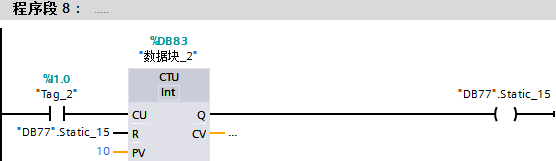 错误2原因:当计数值达到10,"数据块_2".CV=10,紧接着"数据块_2".CV与"数据块_2".PV的比较结果(True)作为计数器R的输入,使得计数值清零,同时复位"数据块_2".QU,在下一网络段"DB77".Static_15依然是False,无法实现脉冲。