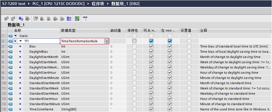 在DB块中创建数据类型“TimeTransformationRule”的变量,需要在数据类型一栏中直接输入“TimeTransformationRule”。