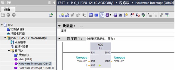 2、OB40 中编程如下图,当硬件输入 I0.0 上升沿时,触发硬件中断执行 MW200 加1。如图3。