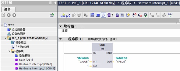 3、OB41 中编程如下图,当硬件输入 I0.1 上升沿时,触发硬件中断执行 MW200 减1。如图4。
