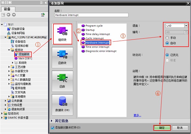 1、按如下步骤创建硬件中断 OB40 ,同样的方法创建 OB41 。如图2。