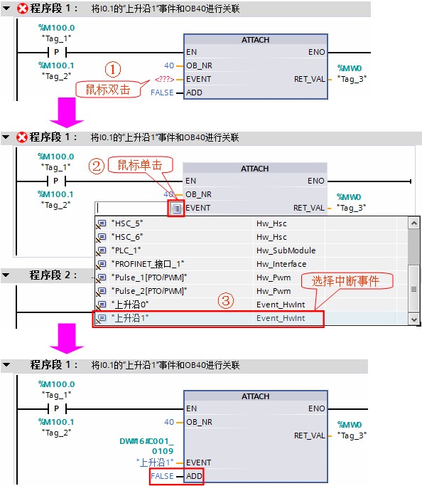 ① 如果“ATTACH”附加指令的引脚“ADD”为 FALSE,EVENT 中的事件将替换 OB40 中的原有事件。即硬件中断事件 I0.1“上升沿1”事件将替换原来 OB40 中关联的 I0.0“上升沿0”事件,见下图10: