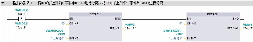 7、如果需要在 CPU 运行期间对中断事件进行分离,可通过“DETACH”指令实现,OB 1 中编程如图12。