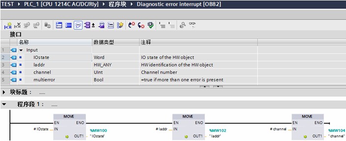 2、OB82 中编程如下图,创建地址为 MW100、MW102、MW104 的变量用于存储出现诊断错误时读取到的启动信息。如图4。