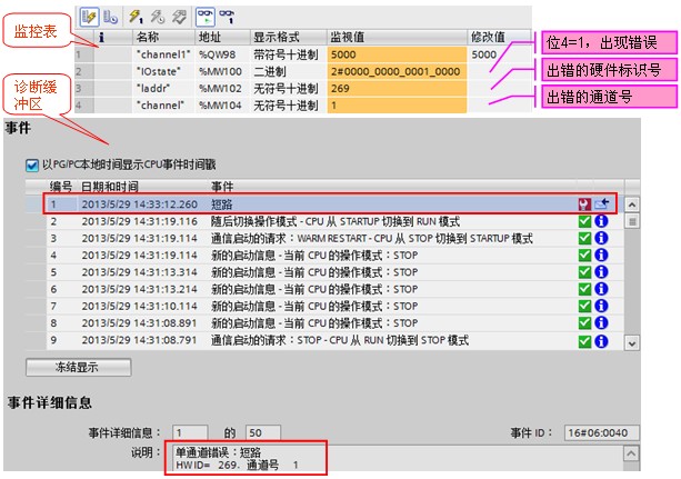 4、测试结果:程序下载后,在监控表中给“channel1”设置输出值5000,如果此时出现了短路故障,则将立即触发诊断错误功能。如图6。