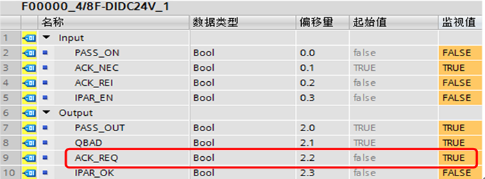 当导致安全模块钝化的故障修复后,对应F-IO DB中的请求应答信号ACK_REQ变为1,表示故障已经解除请求去钝,如图3、图4所示。