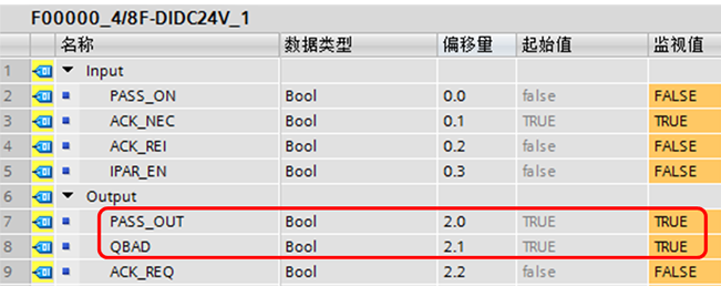 下图是在TIA Portal软件中ET200S 4/8 F-DI模块发生故障进入钝化状态时的F-IO DB变量PASS_OUT和QBAD状态。