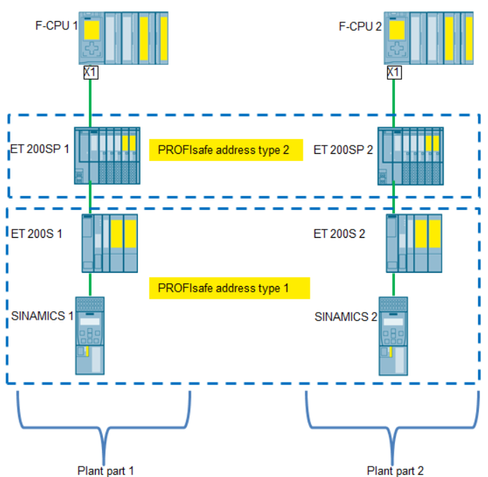 下面的文档显示了不同设备的组态,解释了网络范围和CPU范围的唯一 PROFIsafe 地址的设置。图中两个设备中有PROFIsafe 地址类型1和2特性的F IO和主机架的F IO(参考下图)。