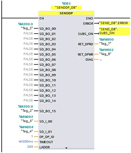 注意:输出变量中,除“RET_DPRD”,“RET_DPWR”和“DIAG”三个变量以外其它的变量都需要用故障安全的数据连接。图3-7 SENDDP中LADDR管脚