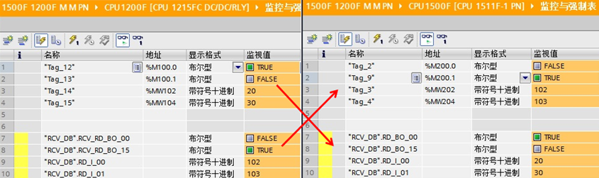 使用监控表监控测试结果,S7-1200F通过SENDDP指令将M100.0,M101.1 和MW102、MW104发送,S7-1500F通过SENDDP指令将M200.0,M200.1和MW202、MW204发送如图3-11。