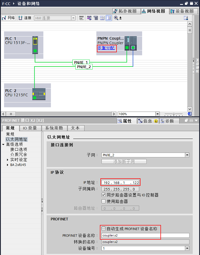 如果两个CPU是分开在两个TIA项目中,只需要将PN Coupler的两个PROFINET接口的配置分开来操作就可以了。即,在CPU1513F的项目中配置PN Coupler上的PROFINET X1接口,在CPU1215FC的项目中配置PN Coupler上的RPOFINET X2接口。