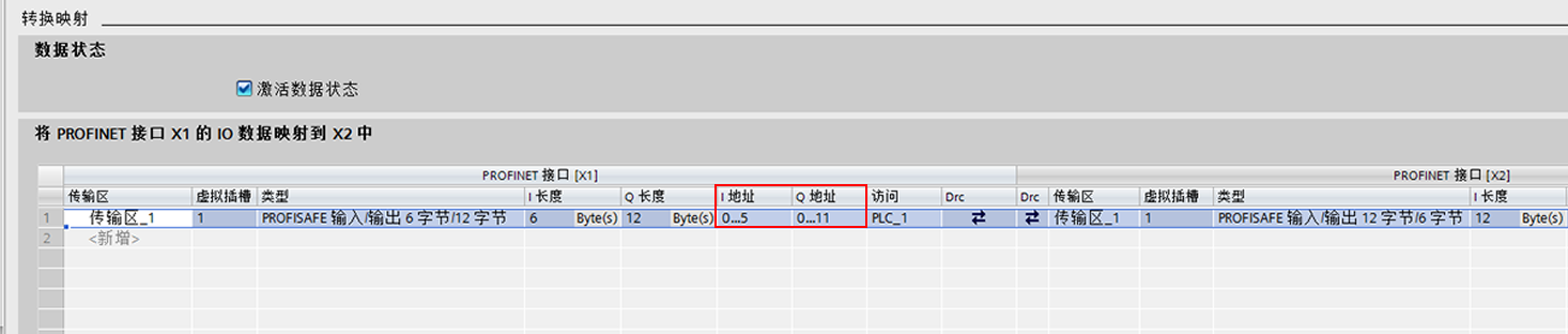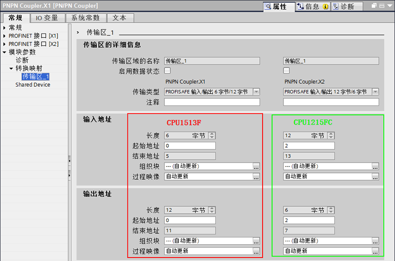 两个CPU在同一个项目中,系统自动在PN Coupler PROFINET接口X2的PLC_2侧自动生成了一个匹配的传输区“PROFISAFE输入/输出 12字节/6字节”,如图 7 所示。