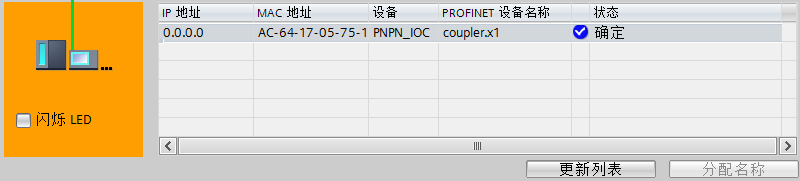 进入分配设备名称界面后,点击“更新列表”会显示出网络中的可访问节点。核对MAC地址与PN Coupler上面印刷的MAC ADDRESS 1相同,确保是PN Coupler上的PROFINET X1接口。点击“分配名称”,如图11所示。