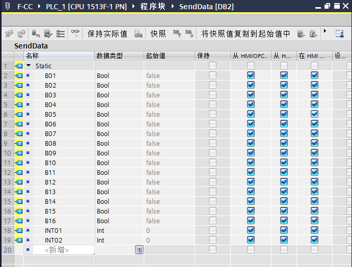 示例中CPU1513F向CPU1215FC发送了2个INT类型的数据,如果要发送DINT类型的数据,只需要将要发送的数据地址填写在SENDDP功能指令的输入参数SD_DI_00处,同时在输入参数DINTMODE=1就可以。