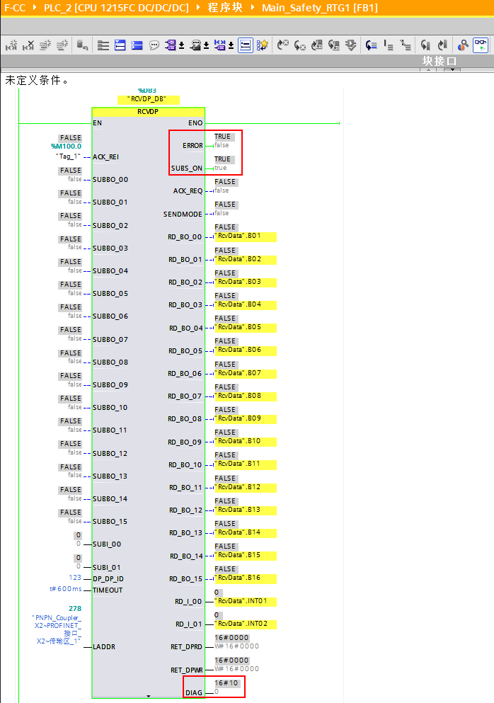 1、将CPU1513F切换到停止模式,CPU1215FC中的RCVDP指令置位输出ERROR和 SUBS_ON =1,同时在输出参数DIAG处显示信息16#10。