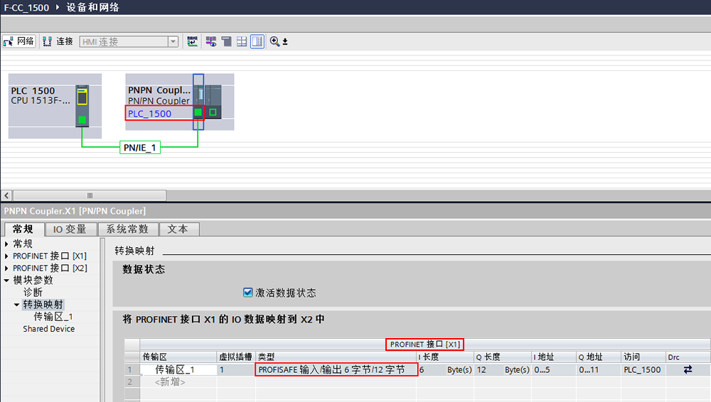 创建一个新项目,并通过“添加新设备”组态 S7-1500 站,在网络视图中配置PN Coupler。鼠标左键点中PN Coupler 左侧X1网络接口,按住鼠标拖拽连接到CPU1513F的PROFINET接口,这样PN Coupler的PROFINET接口X1就连接到CPU1513F。然后设置X1接口的IP地址和设备名称,操作方法与前面的都是相同的,只是不需要再对PN Coupler上的PROFINET X2接口进行配置。之后在“转换映射”中创建“传输区_1”,在PROFINET接口[X1]下面,类型选择“PROFISAFE输入/输出 6字节/12字节”,如图 21 所示。