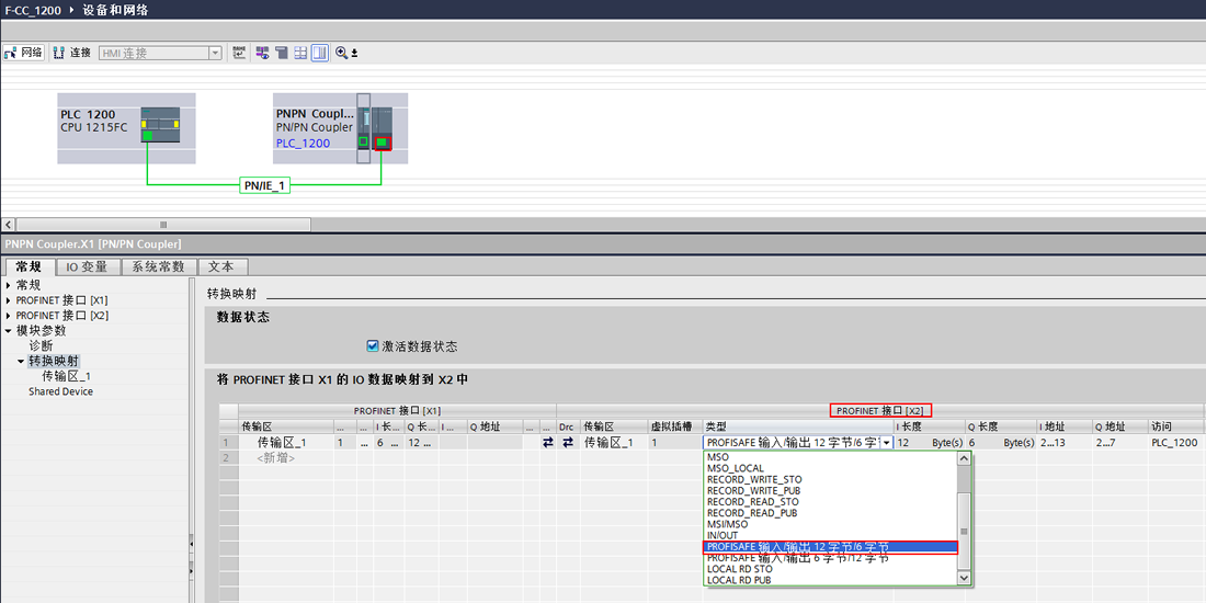 创建一个新项目,并通过“添加新设备”组态 S7-1200 站,在网络视图中配置PN Coupler。鼠标左键点中PN Coupler 左侧X2网络接口,按住鼠标拖拽连接到CPU1215FC的PROFINET接口,这样PN Coupler的PROFINET接口X1就连接到CPI1215FC上。然后设置X2接口的IP地址和设备名称,操作方法与前面的都是相同的,只是不需要再对PN Coupler上的PROFINET X1接口进行配置。之后在“转换映射”中创建“传输区_1”,在PROFINET接口[X2]下面类型选择“PROFISAFE输入/输出 12字节/6字节”,如图 22 所示。