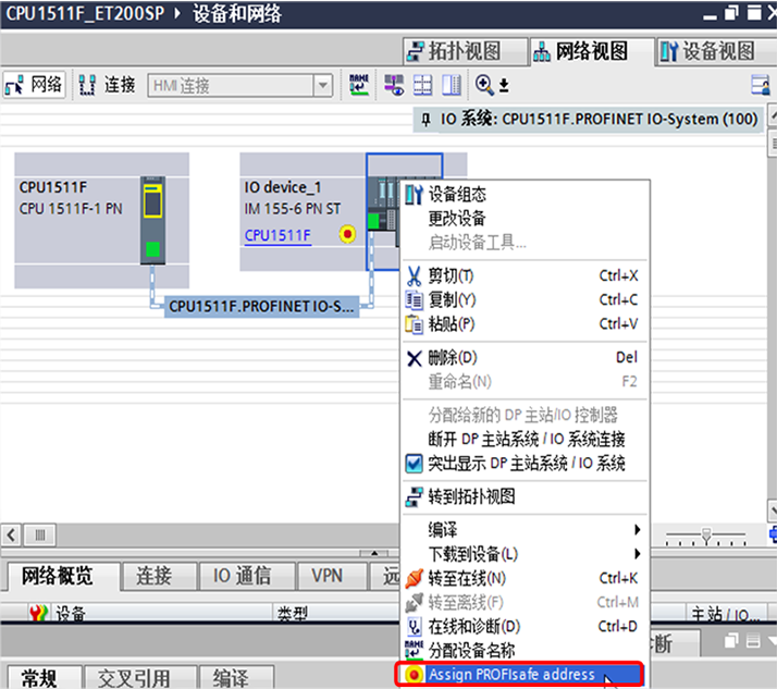 先在网络视图中选中IM155-6站点,点击鼠标右键中“分配Profisafe地址”