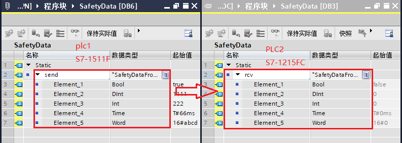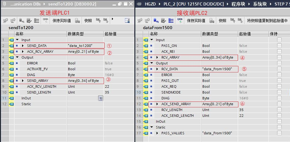 概括来说,对于发送端,①②位于DB块的"Input"接口区,需要由外部传入数据;③位于DB块的"Output"接口区,需要将该数据发送出去。而对于接收端,④位于DB块的"Input"接口区,需要由外部传入数据;⑤⑥位于DB块的"Output"接口区,需要将该数据发送出去。