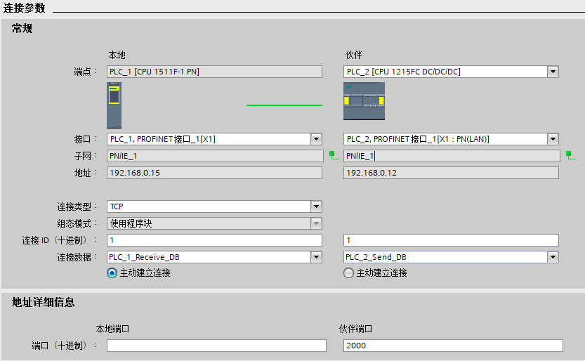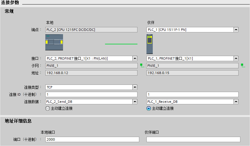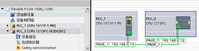 添加S7-1511F和S7-1215FC,分别设置两个CPU的IP地址为192.168.0.15和192.168.0.12,并连接在一个子网中。如图2所示:
