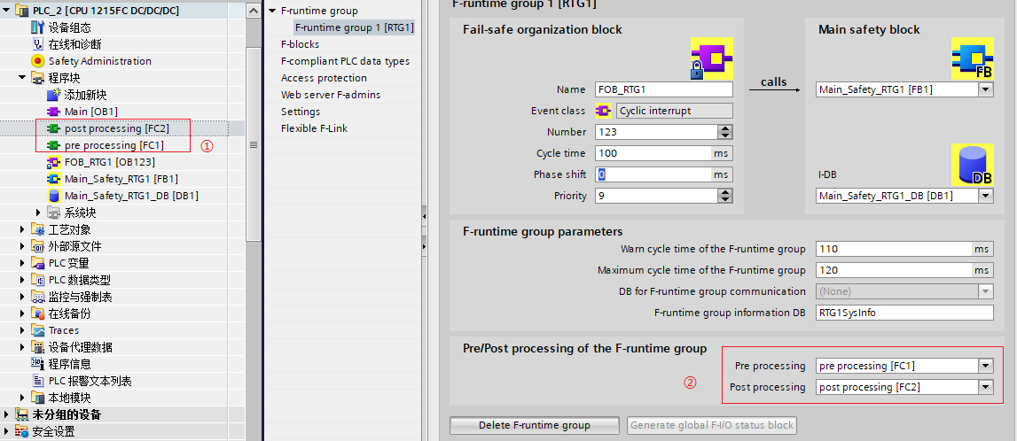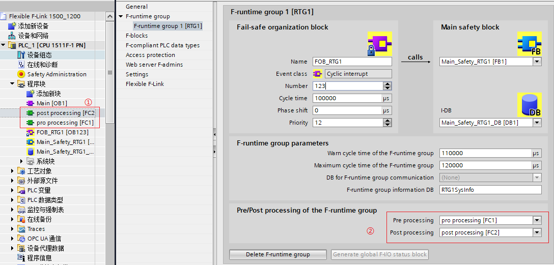 Pre processing 指定的程序块在安全运行组之前运行;Post processing 指令的指令块在安全运行组之后运行。