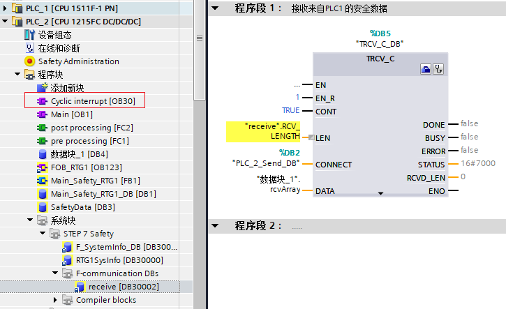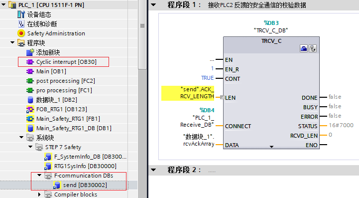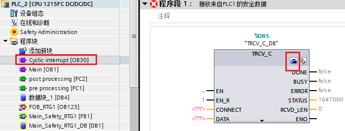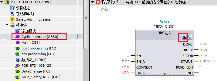 循环中断OB30的循环时间可以调整。OB30中调用TRCV_C,主要用于在安全运行组执行前多次执行接收保证能接收到新的安全校验数据。