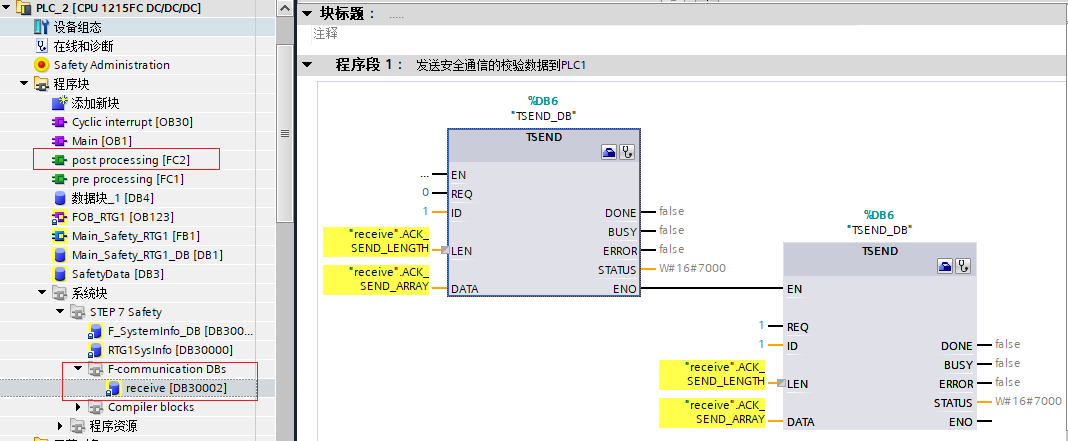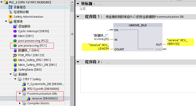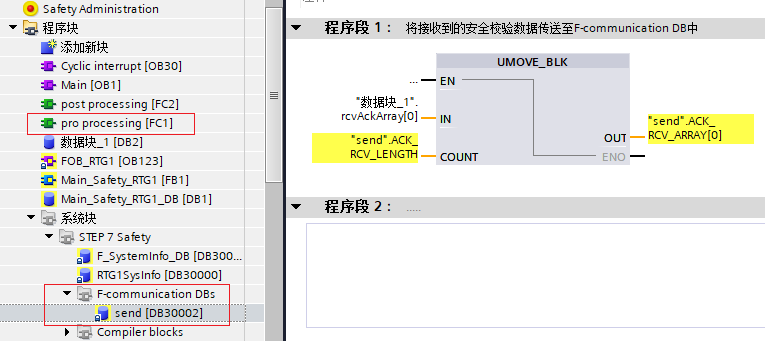 pre processing 指令块将接收的安全校验数据传送至F-communication中。执行安全运行组之前,将数据传送至安全通信DB中。如图10所示: