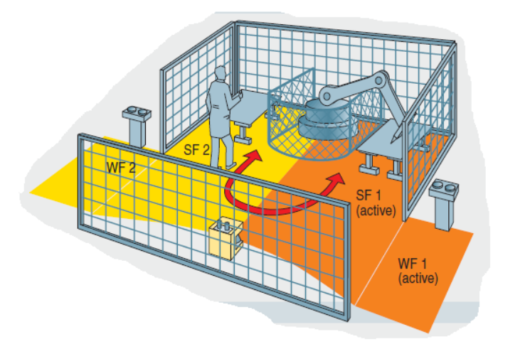 激光扫描仪可根据机器人的位置监视危险区域,并在机器人进入保护区域后关闭其安全 OSSD 输出(输出信号切换装置),从而使 F-CPU 关闭机器人。