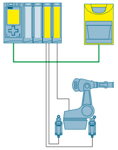 F-CPU 和激光扫描仪可通过 PROFINET 与错误安全“PROFIsafe”配置文件进行通信。可通过两个传感器(例如 SIRIUS 位置开关)来检测机器人位置。