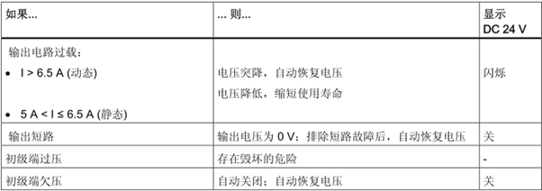 3) 正常工作,DC 24V指示灯绿色常亮,非典型工作条件,电源响应如下(此处电源为5A输出,其他型号参考《S7-300 自动化系统:模块数据》)
