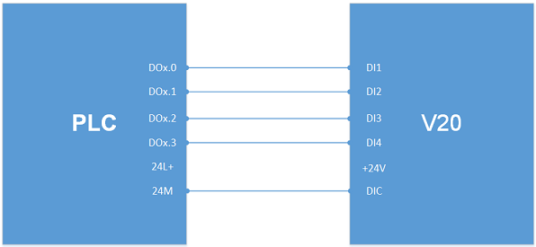 常用接线方式之二:V20由无源接点(干接点)控制,使用外部24V电源